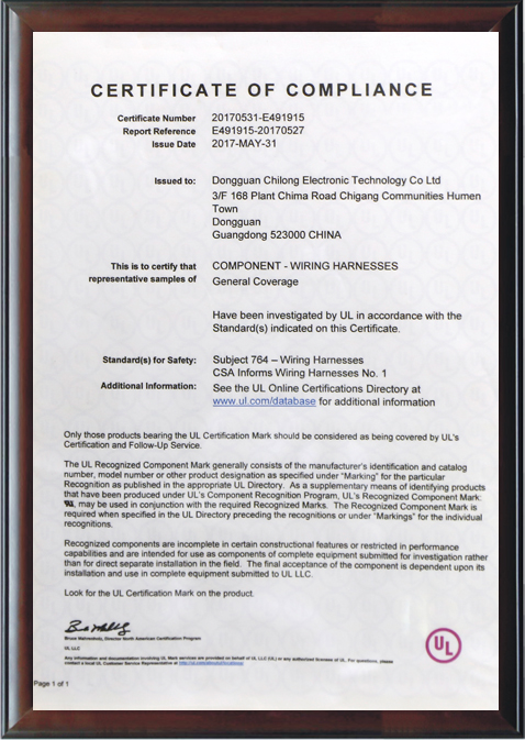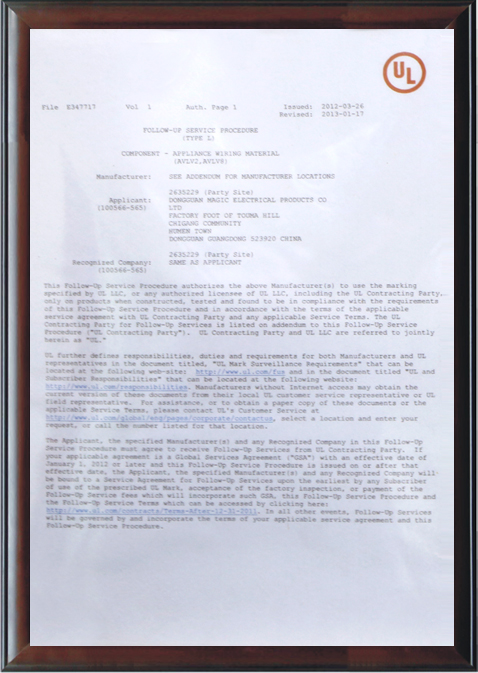 品牌实力保证公司通过并拥有电线之UL安规认证,电线加工之UL认证,质量管理体系之ISO9001认证。